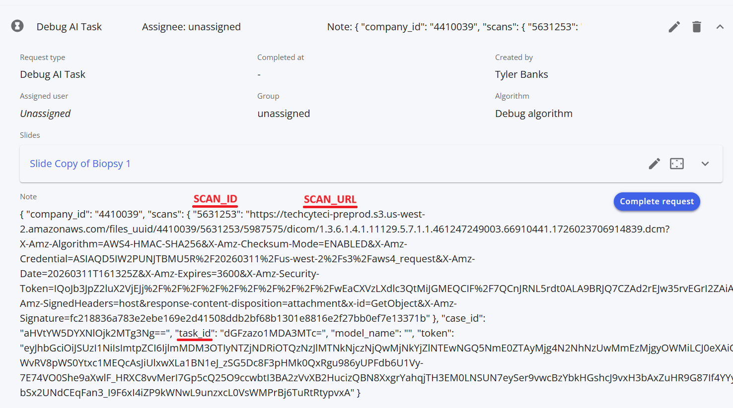 When debugging external bridges and model containers you'll need scan ids, task ids, and image urls. By creating debug request you can view these variables and test locally.